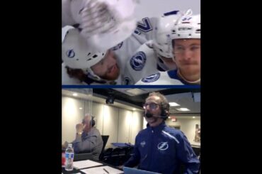L’annonceur Play-by-Play de Lightning Radio, Dave Mishkin, appelle le but gagnant de Brayden Point lors de la victoire 5-4 des…