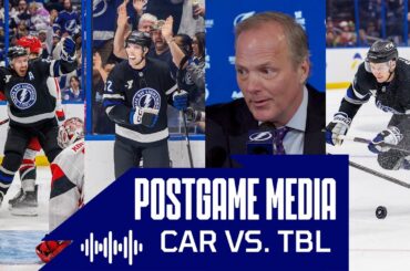 Gage Goncalves, Brandon Hagel, Nick Paul et Jon Cooper parlent aux médias après la victoire du Lightning en tirs de…