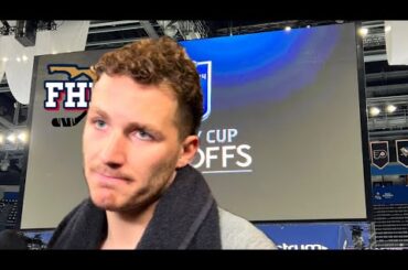 L’attaquant des Panthers de la Floride Matthew Tkachuk s’exprime après que son équipe a battu le Lightning de Tampa Bay…