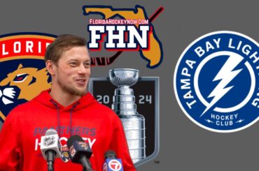Le défenseur des Panthers de la Floride, Gus Forsling, s’exprime avant que son équipe n’accueille le Lightning de Tampa Bay…