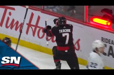 Regardez le capitaine des Sénateurs d’Ottawa Brady Tkachuk marquer un but en échappée après avoir reçu une passe de Tim…