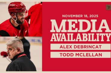Alex DeBrincat et Todd McLellan parlent avec les médias après l’entraînement matinal de Detroit, le mardi 18 novembre 2025, au…