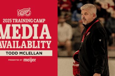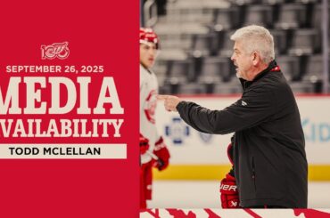 Todd McLellan s’entretient avec les médias après l’entraînement de Détroit le vendredi 26 septembre 2025 au Little Caesars Arena.