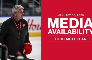 Todd McLellan parle avec les médias après le patin matinal de Détroit à Rogers Place à Edmonton le jeudi 30…