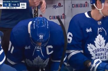 Zack Phillips réagit au match 81 de la saison régulière des Maple Leafs de Toronto contre Steven Stamkos, Brayden Point…