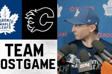 L’entraîneur-chef et les joueurs parlent avec les médias après la victoire de 4-2 des Leafs contre les Flames de Calgary,…