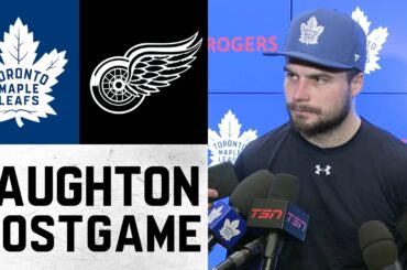 Scott Laughton s’entretient avec les médias à la suite de la défaite 2-1 en prolongation des Leafs contre les Red…