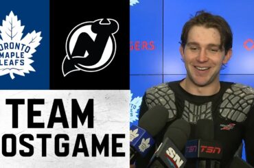 L’entraîneur-chef et les joueurs parlent avec les médias après la victoire 4-0 des Leafs contre les Devils du New Jersey,…