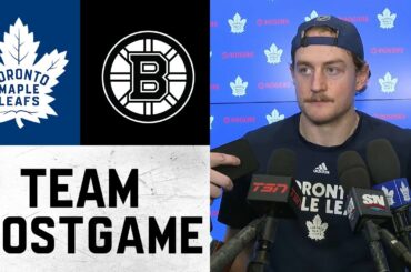 L’entraîneur-chef et les joueurs parlent avec les médias après la défaite 5-3 des Leafs contre les Bruins de Boston, samedi.…