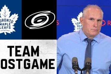 L’entraîneur et les joueurs s’entretiennent avec les médias après la défaite 5-4 des Leafs contre les Hurricanes de la Caroline,…