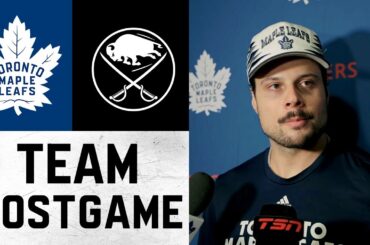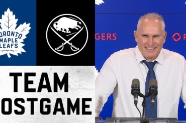 Les joueurs et l’entraîneur parlent avec les médias après la victoire 4-3 des Leafs en prolongation contre les Sabres de…