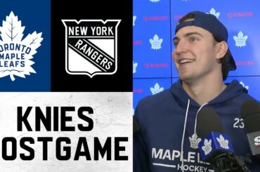 Matthew Knies s’entretient avec les médias après la victoire des Leafs 2-1 en prolongation contre les Rangers de New York,…