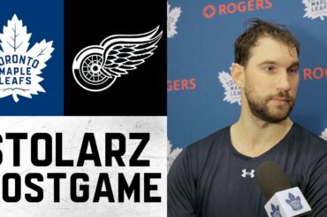 Anthony Stolarz s’entretient avec les médias à la suite de la défaite 6-3 des Leafs face aux Red Wings de…