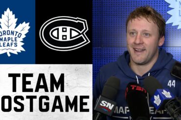Morgan Rielly, Anthony Stolarz, Calle Jarnkrok, Bobby McMann et l’entraîneur-chef Craig Berube parlent avec les médias après la victoire 5-2…