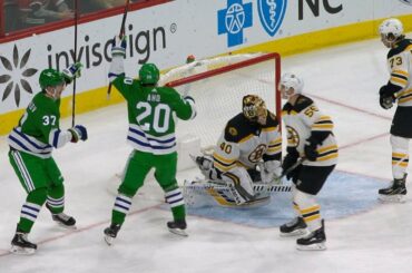 Teuvo Teravainen tire une passe du coin qui dévie vers un joueur des Bruins devant, déclenchant les sons nostalgiques de…