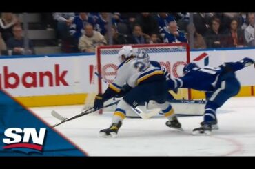 Regardez l’attaquant des Blues de St. Louis Brandon Saad traverser la zone pour une situation en tête-à-tête avec Mitch Marner…