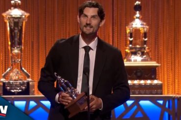 Regardez Connor Hellebuyck des Jets de Winnipeg remporter le trophée Vézina 2023-24, décerné au meilleur gardien de but de la…