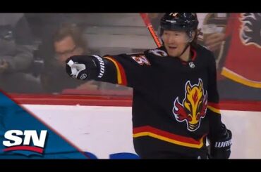 Regardez l’attaquant des Flames de Calgary Tyler Toffoli enfouir son 30e but de la saison sur une passe d’Elias Lindholm…