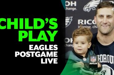 Nick Sirianni s’entretient avec les médias de Philadelphie avec son fils Miles après la victoire des Eagles sur les Jaguars.…