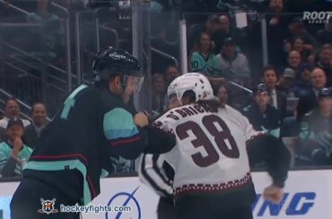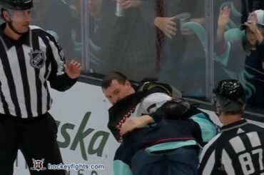 Liam O’Brien contre Jamie Oleksiak des Coyotes de l’Arizona au match de Seattle Kraken le 3 avril 2023. via https://www.hockeyfights.com