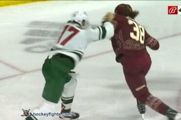 TJ Oshie contre Mathew Dumba des Capitals de Washington au match Wild du Minnesota le 19 mars 2023. via https://www.hockeyfights.com