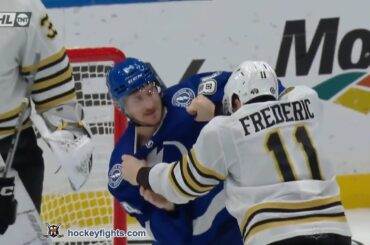 Trent Frederic contre Tanner Jeannot des Bruins de Boston lors du match du Lightning de Tampa Bay le 27 mars…