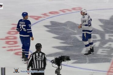 Tanner Jeannot contre Ryan Reaves du Lightning de Tampa Bay lors du match des Maple Leafs de Toronto le 3…