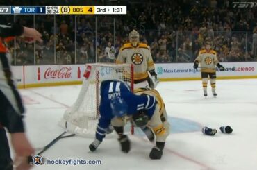 Tyler Bertuzzi contre Parker Wotherspoon des Maple Leafs de Toronto lors du match des Bruins de Boston le 7 mars…