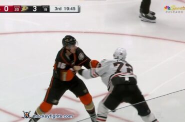 Radko Gudas contre MacKenzie Entwistle des Ducks d’Anaheim au match des Blackhawks de Chicago le 12 mars 2024. via https://www.hockeyfights.com