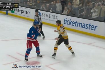 Jacob Trouba contre Trent Frederic des Rangers de New York lors du match des Bruins de Boston le 16 décembre…