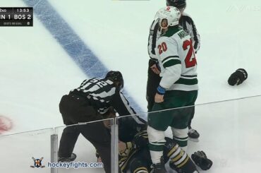 Pat Maroon contre Parker Wotherspoon du Wild du Minnesota lors du match des Bruins de Boston le 19 décembre 2023.…