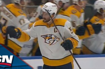 Regardez le défenseur des Nashville Predators Roman Josi lancer un tir sur réception d’une passe de Filip Forsberg de la…