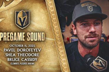 Pavel Dorofeyev, Shea Theodore et l’entraîneur-chef Bruce Cassidy parlent aux médias après un entraînement matinal d’avant-match à la Climate Pledge…