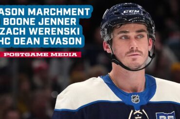 Mason Marchment, Boone Jenner, Zach Werenski et l’entraîneur-chef Dean Evason s’adressent aux médias après le match. Suivez le #CBJ sur…