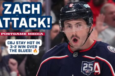 Zach Werenski, Sean Monahan, Jet Greaves et l’entraîneur-chef Dean Evason parlent aux médias après notre victoire 3-2 contre les Blues.…