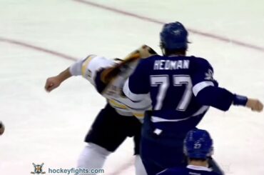 Marcus Foligno contre Victor Hedman des Buffalo Sabres au Tampa Bay Lightning Game le 12 janvier 2017. Via http://www.hockeyfights.com