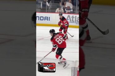 Les Devils du New Jersey avancent Jack Hughes et Jesper Bratt pendant les échauffements avant le match NJ Devils vs…