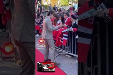 L’attaquant des Devils du New Jersey Jack Hughes signe des autographes pour les fans sur le tapis rouge avant l’ouverture…