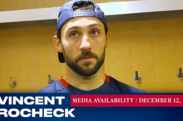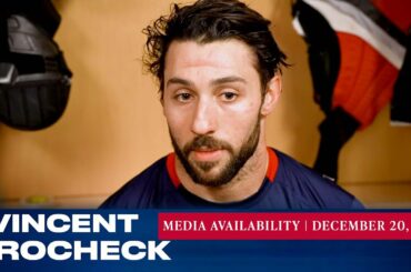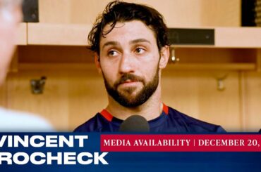 L’attaquant des Rangers de New York Vincent Trocheck répond aux questions des médias avant le match du 20 décembre contre…