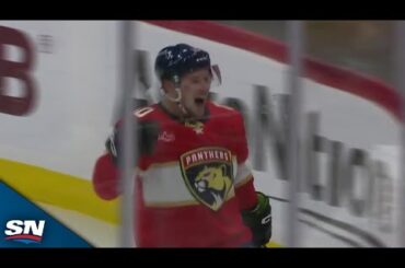L’attaquant des Panthers de la Floride Vladimir Tarasenko s’exprime après que son équipe a battu les Flames de Calgary en…