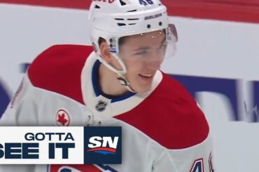 Regardez Lane Hutson des Canadiens de Montréal enfiler un tir du poignet à bout portant devant le gardien des Jets…