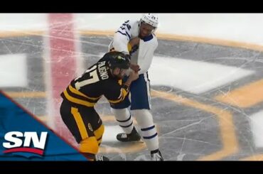 Michael Pezzetta contre Wayne Simmonds des Canadiens de Montréal au match des Maple Leafs de Toronto le 8 avril 2023.…