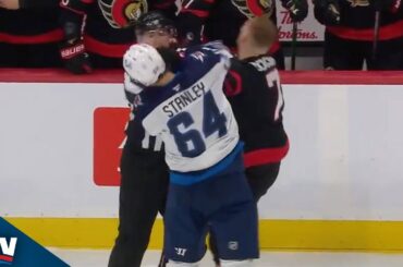 Regardez le défenseur des Jets de Winnipeg Logan Stanley laisser tomber son gant et frapper Brady Tkachuk avec un coup…