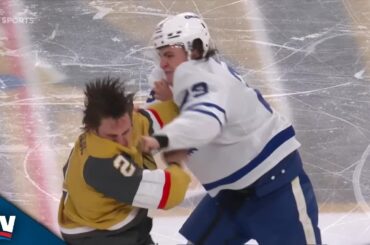 Regardez Matthew Knies de Toronto Maple Leafs abandonner les gants avec Zach Whitecloud de Vegas Golden Knights hors du match…