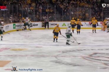 Zachary L’Heureux contre Ben Jones des Predators de Nashville au match du Minnesota Wild le 31 décembre 2024. via https://www.hockeyfights.com
