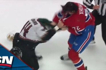 Regardez le défenseur des Canadiens de Montréal Arber Xhekaj lâcher les gants avec l’attaquant des Coyotes de l’Arizona Zack Kassian…