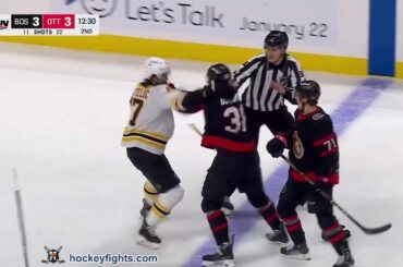 Mark Kastelic vs Zack Ostapchuk du jeu Boston Bruins at Ottawa Senators le 18 janvier 2025. Via https://www.hockeyfights.com