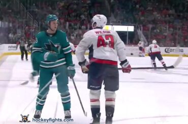 Tom Wilson vs Zack Ostapchuk du match de Washington Capitals at San Jose Sharks le 15 mars 2025. Via https://www.hockeyfights.com