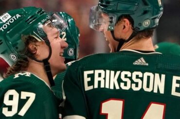 L’attaquant du Wild du Minnesota, Kirill Kaprizov, marque après avoir lancé la rondelle hors des bandes derrière le filet et…