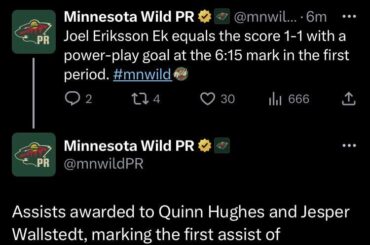 Regardez le défenseur du Minnesota Wild Quinn Hughes donner suite à son échec en dehors du tableau pour marquer un…